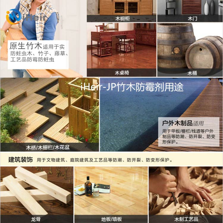 iHeir-JP竹木防霉剂是广州艾浩尔防霉抗菌科技有限公司研制出来的一种高效、环保防霉杀菌剂。可将本产品混合进木制品预浸水的工作液当中,防止霉菌在竹木制品中的滋生,抑杀木制品深层的霉菌孢子,并在产品表面形成一层保护层,阻止霉菌的滋生,达到长效防霉防腐的目的。木材处理后表面无沉淀物,色泽均匀,经iHeir-JP竹木防霉剂处理后的木材,可保持280天到一年内即使潮湿都不会发霉。